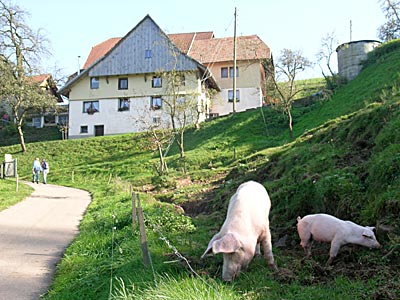 So erscheint der Hof, wenn man von St. Peter mit dem Auto kommt. Die Schweine gehören auch dazu. Davon später mehr.