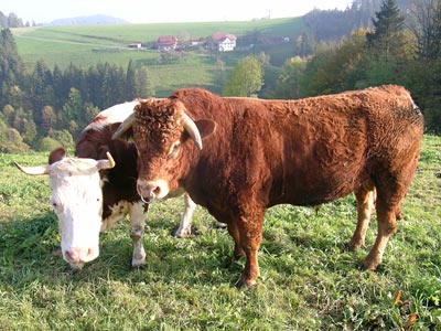 ... man nennt das Mutterkuhhaltung. Die Kälber werden das ganze Jahr über geboren. Hier sieht man den Bullen Charlie mit einer Kuh.